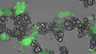 The interaction between gold nanorods and HeLa cells in acoustic fields showing strong attachment (shown at real speed under 500X magnification). Credit: Mallouk Lab, Penn State University.